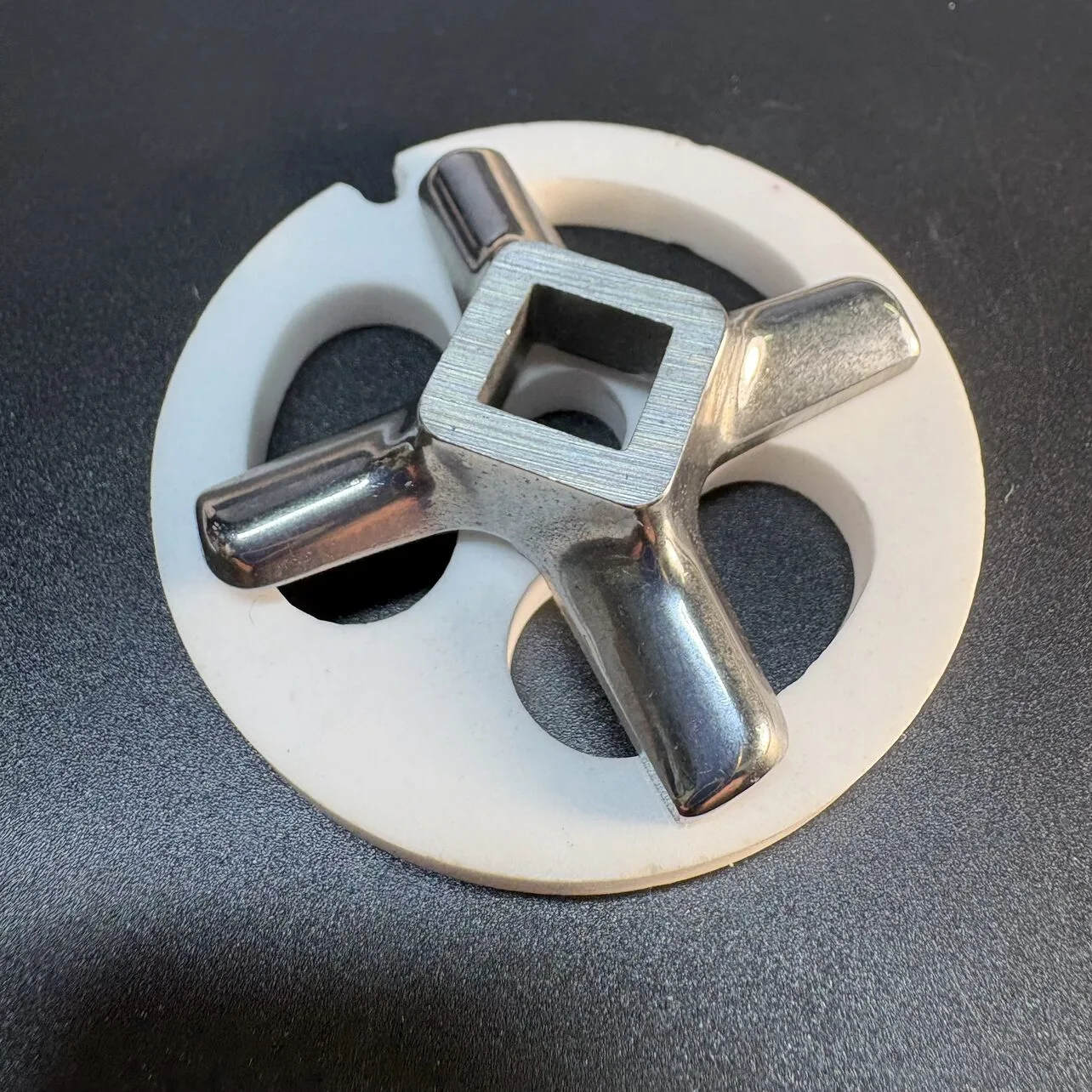 Набор для мясорубки. Условный диаметр - 62 mm. Центральное отверстие - 9 mm. Подрезная керамическая решетка. Посадка ножа - квадрат 10 mm.