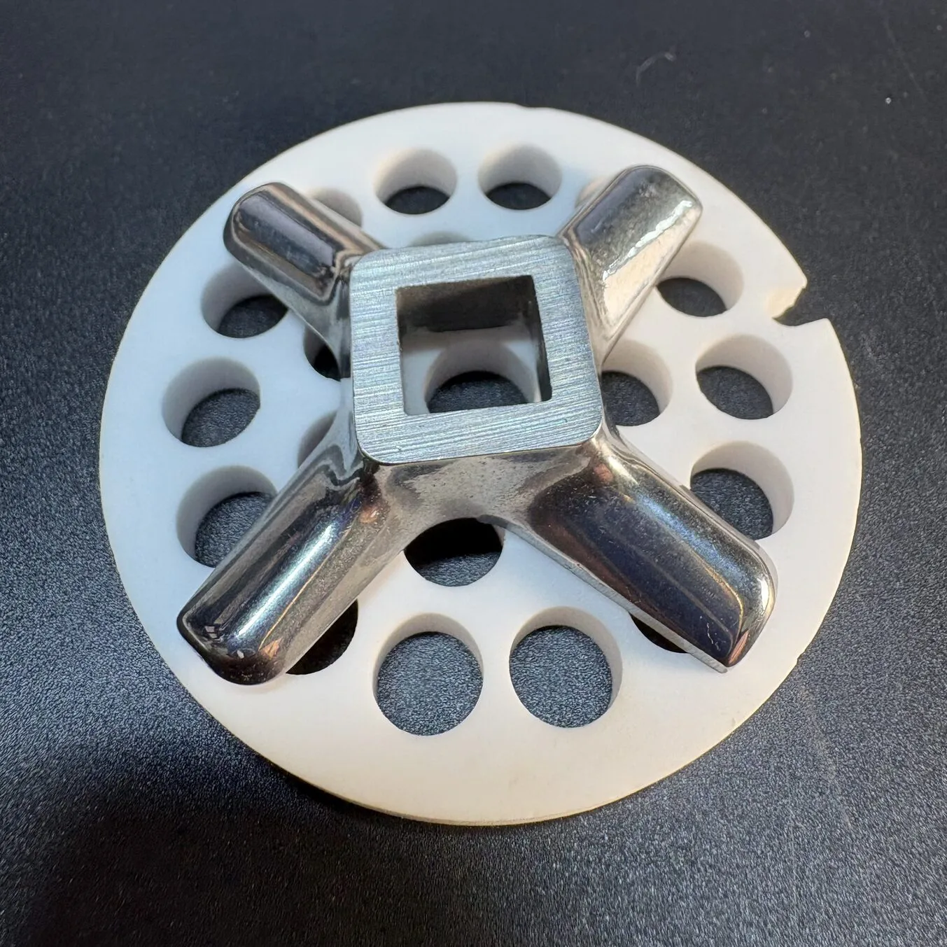 Набор для мясорубки с керамической решеткой. Условный диаметр - 62 mm. Центральное отверстие - 9 mm. Рабочие отверстия - 8 mm. Посадка ножа - квадрат 10 mm.