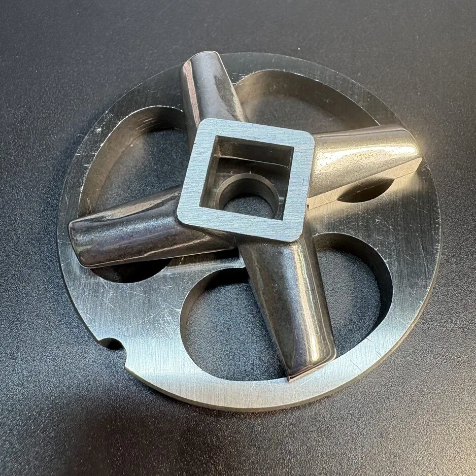 Набор для мясорубки с подрезной решеткой. Условный диаметр - 69 mm. Центральное отверстие - 10 mm. Посадка ножа - квадрат 12 mm.