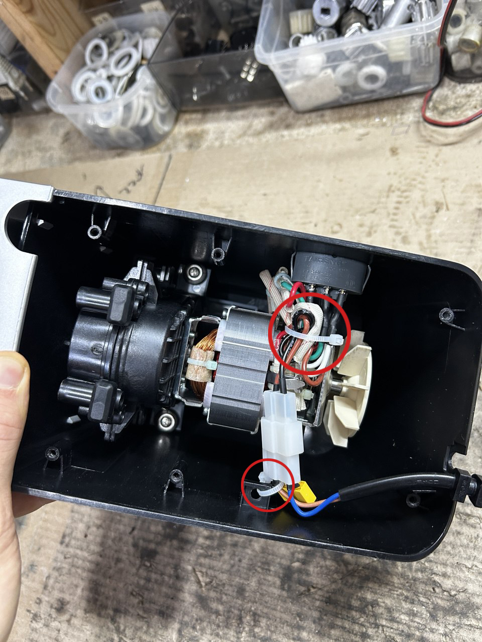 После того, как стяжки сняты, можно отсоеденить разъем и вытащить провод питания мясорубки